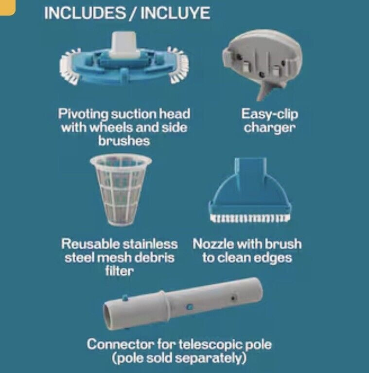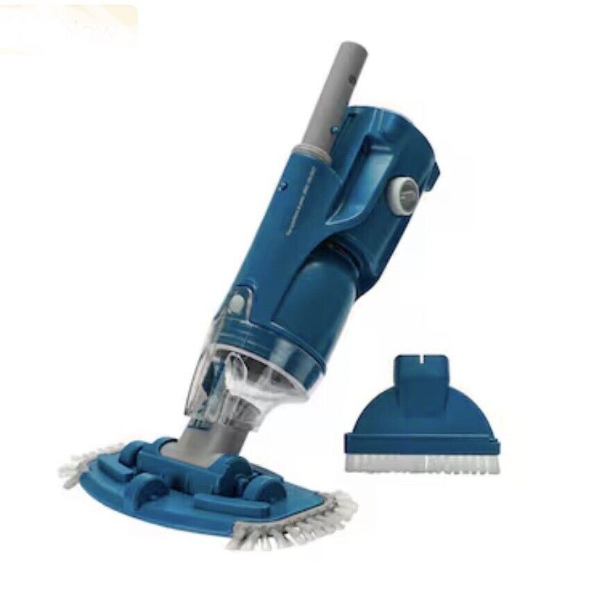 Introducing the 11-in Rechargeable Handheld Pool Vacuum, designed for effortless cleaning of dirt, sand, and small leaves from your pool. This versatile vacuum includes two interchangeable attachments: a larger vacuum head for cleaning floor areas and a smaller attachment for hard-to-reach corners or steps. The vacuum features a connector compatible with all industry-standard pool poles with a 1.16-in to 1.25-in inner diameter (pole sold separately). Powered by a rechargeable internal lithium battery, it provides consistent performance for up to 30 minutes. The reusable stainless steel mesh debris filter cage ensures efficient debris collection, while the quick drain system releases clean water when lifting the cleaner out of the pool. Ideal for underwater vacuuming without the need for a hose or filtration system, this vacuum offers quick and convenient cleanups. Keep your pool pristine with the 11-in Rechargeable Handheld Pool Vacuum.
